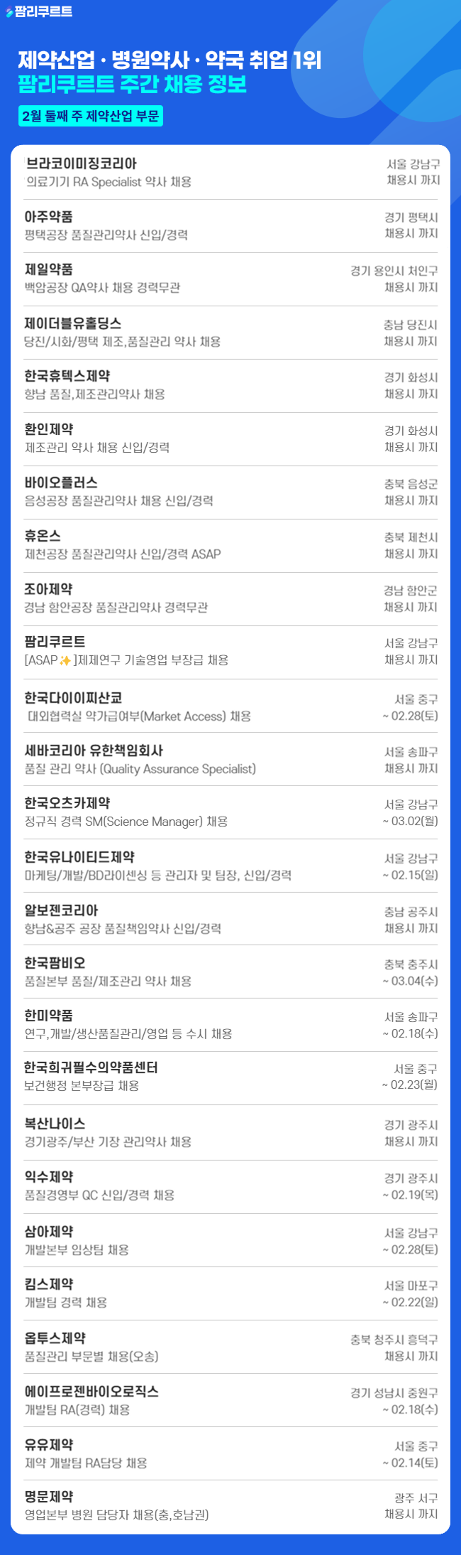 [팜리쿠르트] 브라코·아주약품·제일약품 등 약사 채용
