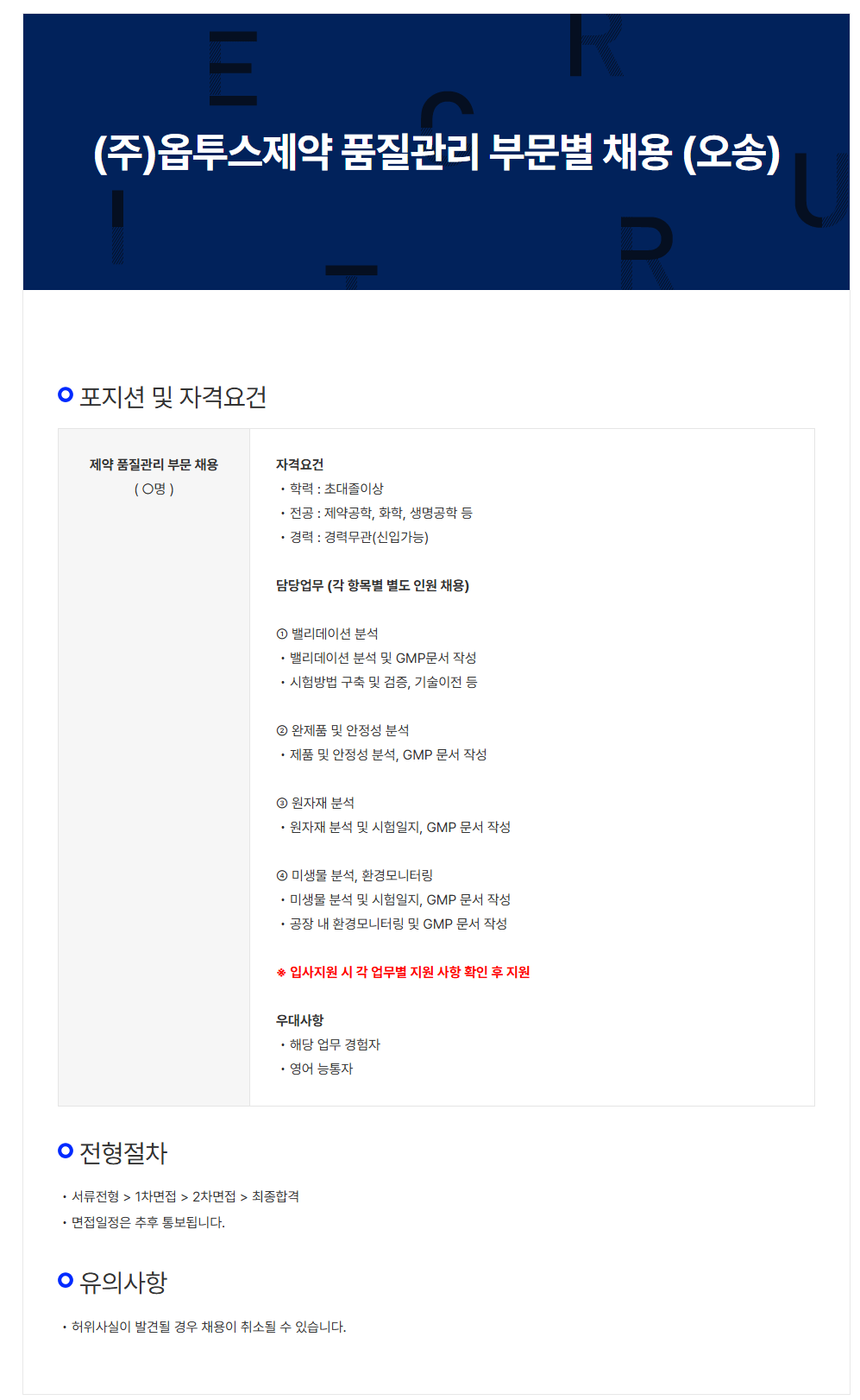 | 제약·산업 > 생산품질 | 품질관리 부문별 채용 |
