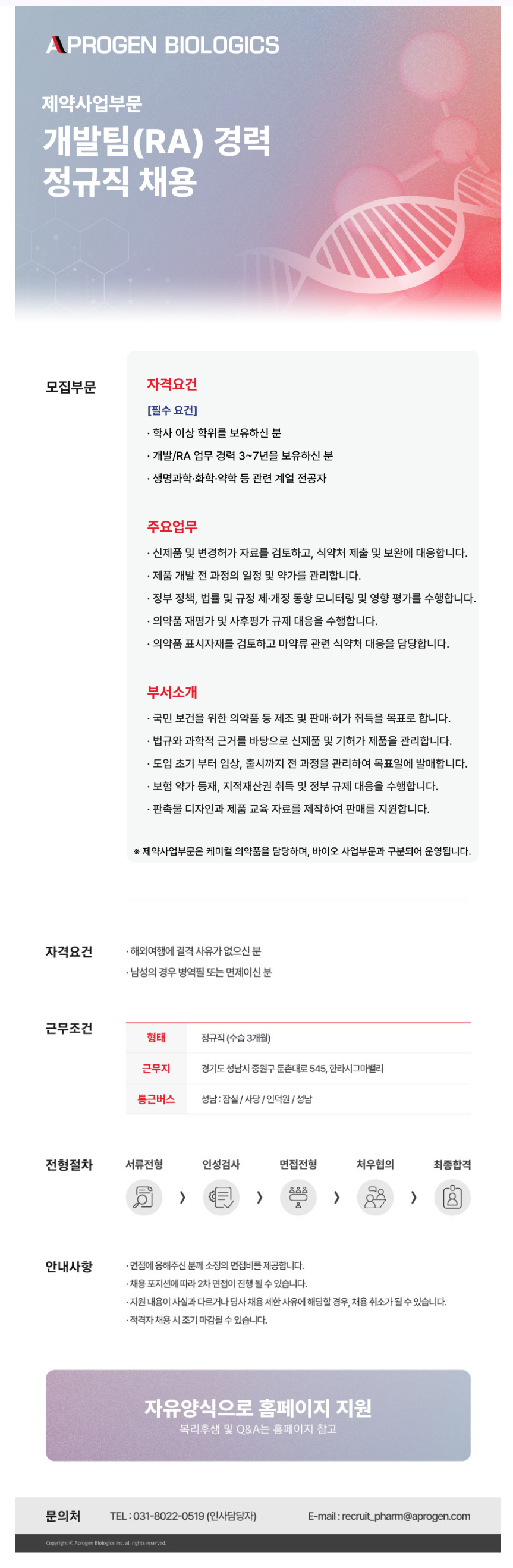 | 제약·산업 > 연구개발 | 개발팀 RA(경력) 채용 |
