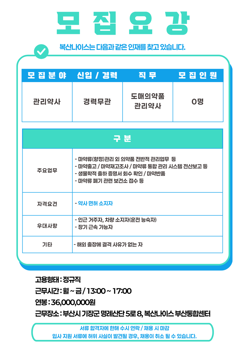 [기장 장안] 복산나이스 관리약사 채용