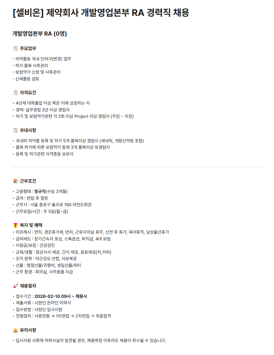 | 제약·산업 > 연구개발 | 개발영업본부 RA 경력 채용 |